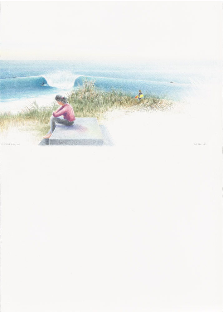 Realizado con lápices de color (polícromos de Faber Castell, gama WGrey III, IV, V y VII) sobre papel Saunders Waterford Series (NOT) de 360 gr/m2, tiene marca al agua y bordes a la forma.